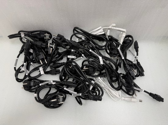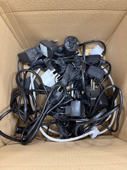 BOX OF ASSORTED ADAPTERS TO INCLUDE APPLE EU PLUGS, CAT CABLES & OTHERS (MIXED PLUGS)
