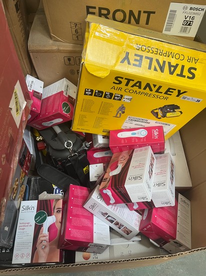 PALLET OF ASSORTED ITEMS TO INCLUDE NUTRIBULLET JUICER, TECHWOOD TMACH-1091, STANLEY AIR COMPRESSOR AND SILK’N BEAUTIFUL TECHNOLOGY PURE NETTOYAGE PURIFIANT DU VISAGE (EU PLUG)